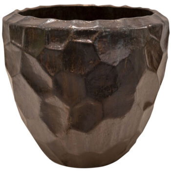 SOORTHoge robuuste bloempot in stoer verweerd brons-goudkleur van handgemaakt keramiek. Met subtiel en opliggend grillig honingraadpatroon. De lichtinval laat een gouden shimmer zien, in het donker een diep donker brons.