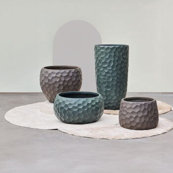 SOORTHoge prachtig vormgegeven bloempotten set in mat brons zwart. Zeer lichtgewicht hq set. Het reliëf speelt met het licht waardoor je veel diepte krijgt. Met subtiel en opliggend grillig honingraadpatroon. Al jaren één van onze favoriete designs in een heerlijk matte uitvoering.