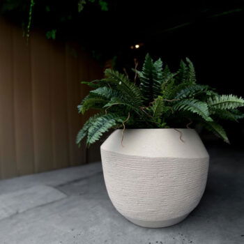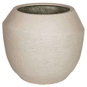 SOORTHeerlijk grote bloempot met subtiel breed gelaagde ribpatroon in zacht zandkleur. Handgemaakt en een stralend middelpunt in je interieur of tuin. Geschikt voor binnen en buiten.