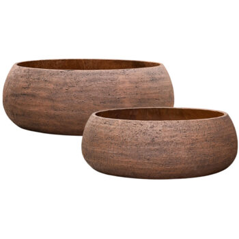 Afmetingen: 72 x 72 x 23 cm & 92 x 92 x 31 cm Opening: 58 cm & 75 cm Diepte: 22 cm & 30 cm Kleur: Aarde koper brons Aantal: 2 stuks Artikelnummer: 3572 Gebruik: outdoor, voor gebruik indoor kunt u een binnenvaas bijbestellen via deze link. Bijna al onze potterie handgemaakt en daarom uniek in patroon, kleuring en niet 100% waterdicht. Een binnenvaas is ideaal om duurzaam te genieten van alle indoor geplaatste potterie. En om eenvoudig te wisselen van inhoud en styling.