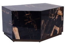 SOORTLuxe versteen houten bijzettafel in warm zwart bruin met crème gemeleerd met een glanzende afwerking polyesterhars topcoat. De tafelpoten zijn RVS met messing afgewerkt. Versteend hout is een natuurlijk materiaal waardoor het uiterlijk per item kan verschillen. Dit maakt elk item uniek.