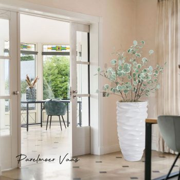 SOORTHoge vaas in glanzend helderwit met een zacht flowend golfpatroon. Van high quality kunststofsteen dus makkelijk in onderhoud en oersterk. Duurzaam genieten dus!