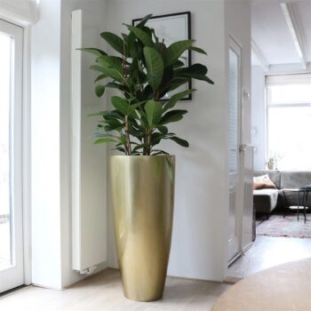 Afmeting: 50 x 50 x 90 cm Opening: 41 cm Diepte: 37 cm Kleur: Geoxideerd Messing Aantal: 1 stuk Artikelnummer: 2701 Gebruik: Indoor, voor 100% waterdichtheid kunt u een binnenvaas bijbestellen via deze link. Bijna al onze potterie handgemaakt en daarom uniek in patroon, kleuring en niet 100% waterdicht. Een binnenvaas is ideaal om duurzaam te genieten van alle indoor geplaatste potterie. En om eenvoudig te wisselen van inhoud en styling.