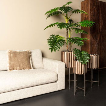 SOORTLuxe design bloempot met verfijnd design in koperkleur op een hoge donker metalen onderstel Een prachtige aanvulling in je interieur. Prachtig als los object, maar ook mooi om te combineren met een andere hoogte.