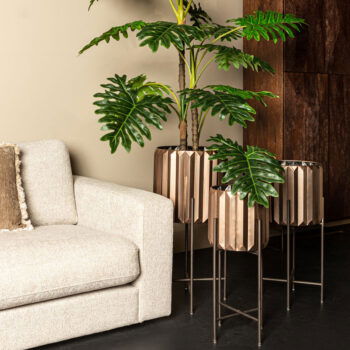 Afmetingen: D25 H81, D31 H105, D36 H120 Kleur: Zilver metaal & brons Aantal: 3 stuks Artikelnummer: 719944 Gebruik: Indoor, voor 100% waterdichtheid kunt u een binnenvaas bijbestellen via deze link. Bijna al onze potterie handgemaakt en daarom uniek in patroon, kleuring en niet 100% waterdicht. Een binnenvaas is ideaal om duurzaam te genieten van alle indoor geplaatste potterie. En om eenvoudig te wisselen van inhoud en styling.