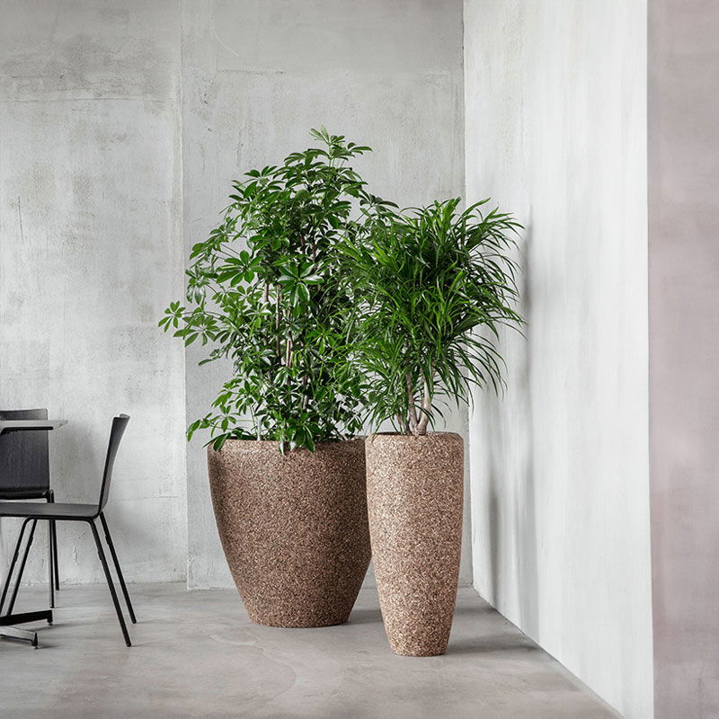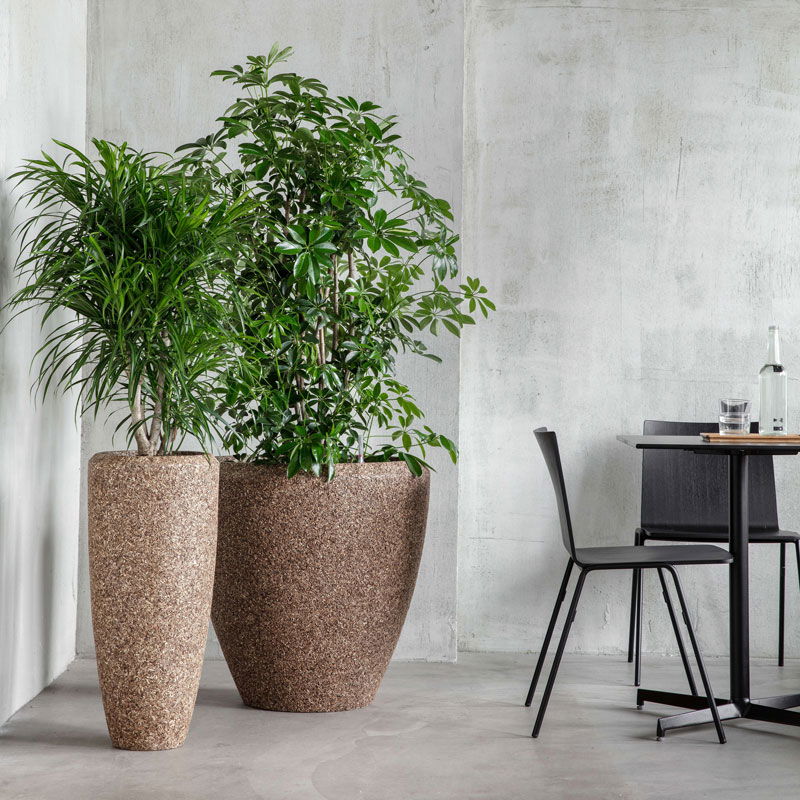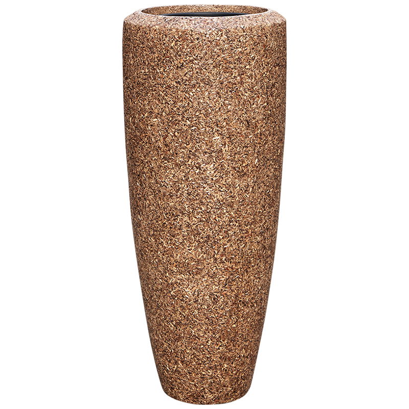 Hoge en duurzame bloempot in een zacht elegant vaas model met heerlijk matte, ruwe finish. De bloempot is gemaakt van bosrestanten als droge bladeren, takken en boomschors. Hij is volledig biologisch afbreekbaar en recyclebaar.