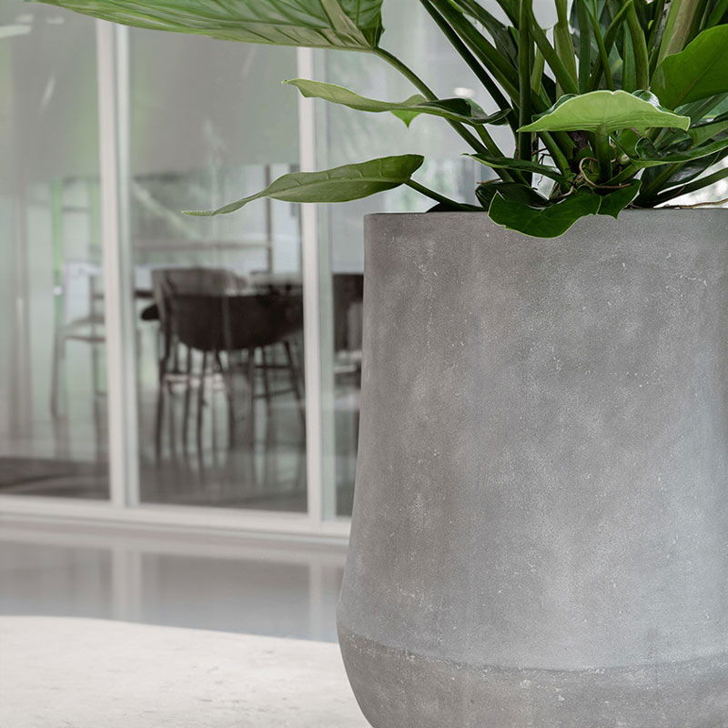 Robuuste bloempot met bijzondere elegante vorm in stoer grijs betonlook. Van licht gewicht maar hoge kwaliteit kunststof steen. Makkelijker dus om te verplaatsen dan echt beton.