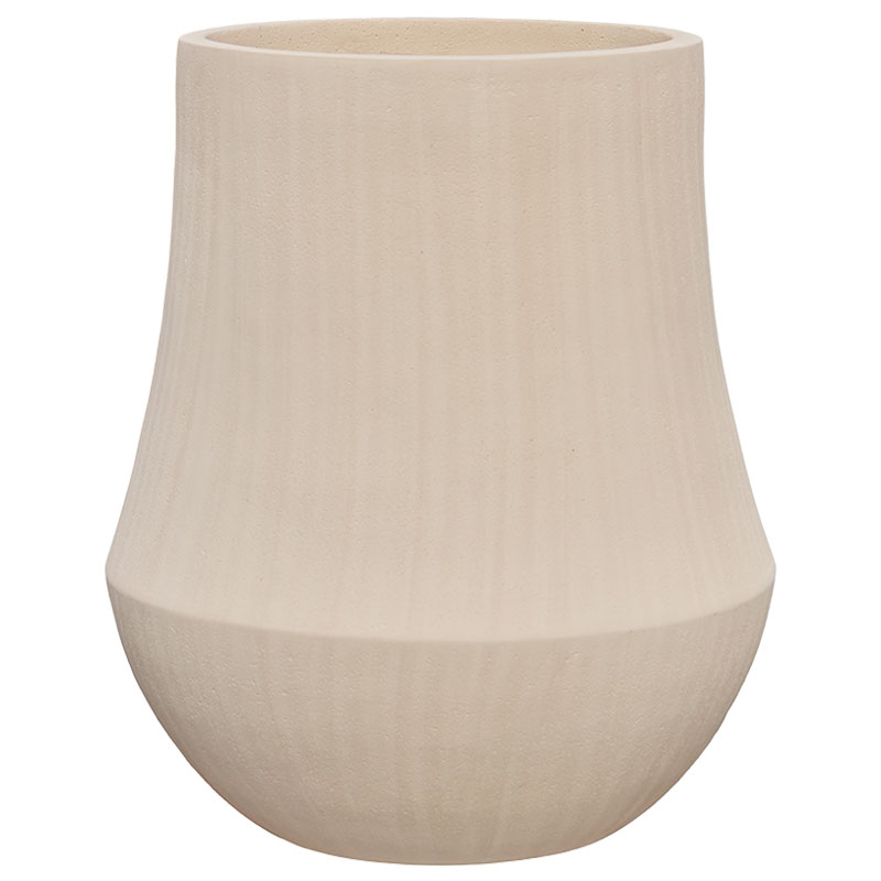 Robuuste bloempot met bijzondere elegante vorm in stoer grijs betonlook. Van licht gewicht maar hoge kwaliteit kunststof steen. Makkelijker dus om te verplaatsen dan echt beton.