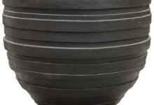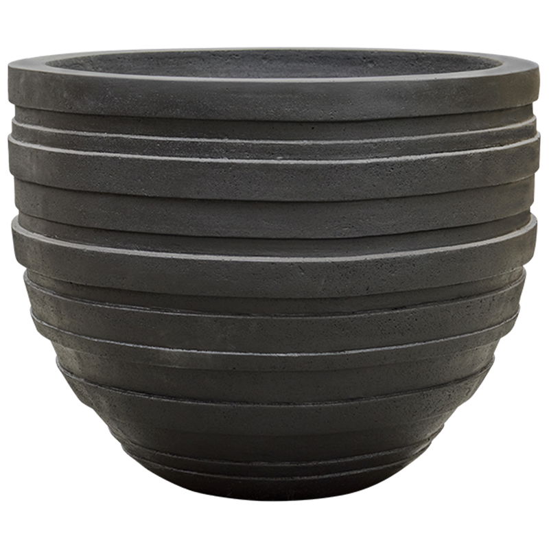 Grote brede XL plantenbak in warm en robuust zandsteen rookzwart met bijzonder diepte streepreliëf. Van hoogwaardig kunststofsteen dus lichter van gewicht dan steen maar oersterk en makkelijk in onderhoud. Geschikt voor buiten maar ook prachtig binnenshuis.