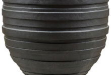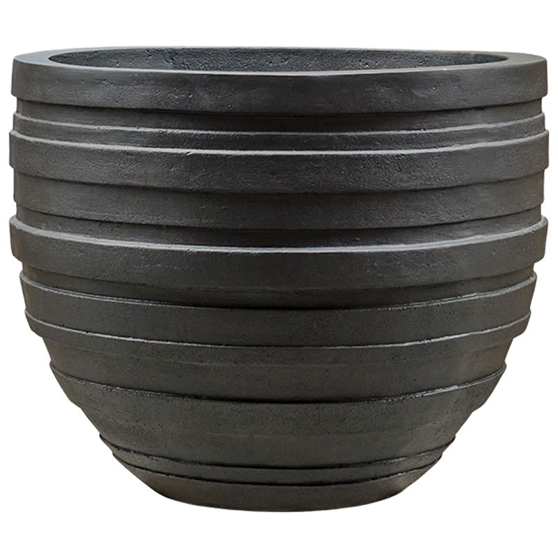 Grote brede XL plantenbak in warm en robuust zandsteen rookzwart met bijzonder diepte streepreliëf. Van hoogwaardig kunststofsteen dus lichter van gewicht dan steen maar oersterk en makkelijk in onderhoud.
