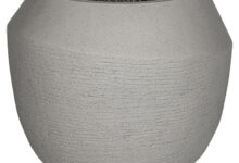 Heerlijke grote design plantenbak met subtiel breed gelaagde ribpatroon in zacht zandkleur. Handgemaakt en een stralend middelpunt in je interieur of tuin. Geschikt voor buiten maar ook geweldig voor binnen met een mooie kunstboom of kunstplanten.