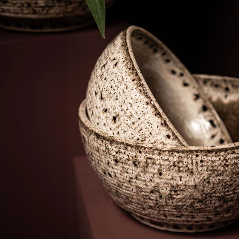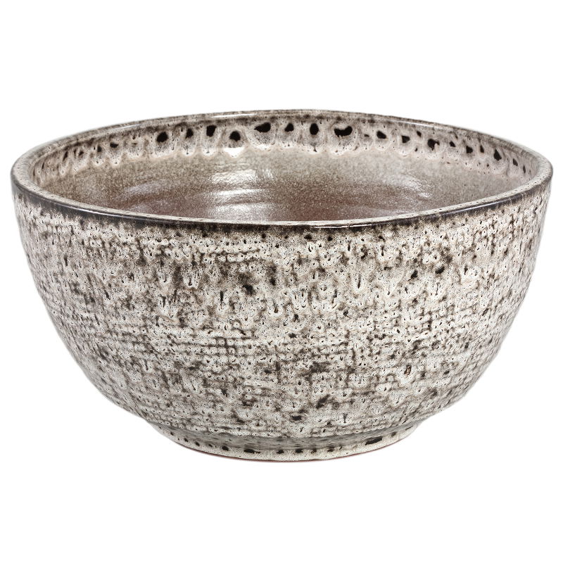 Een plaatje van een grote bloempot in schaalvorm. Keramiek met een levendig glazuur en reliëf. Prachtige aanvulling in je interieur.
