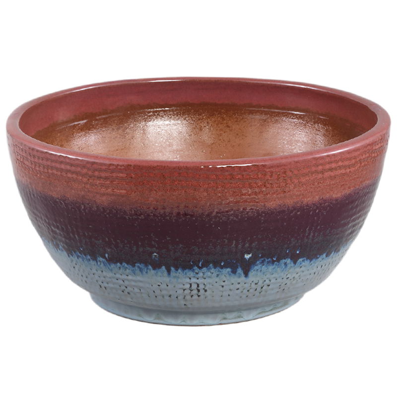 Een plaatje van een bloempot in schaalvorm. Keramiek met een kleurrijk glazuur en reliëf. Prachtige aanvulling in je interieur.