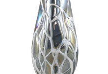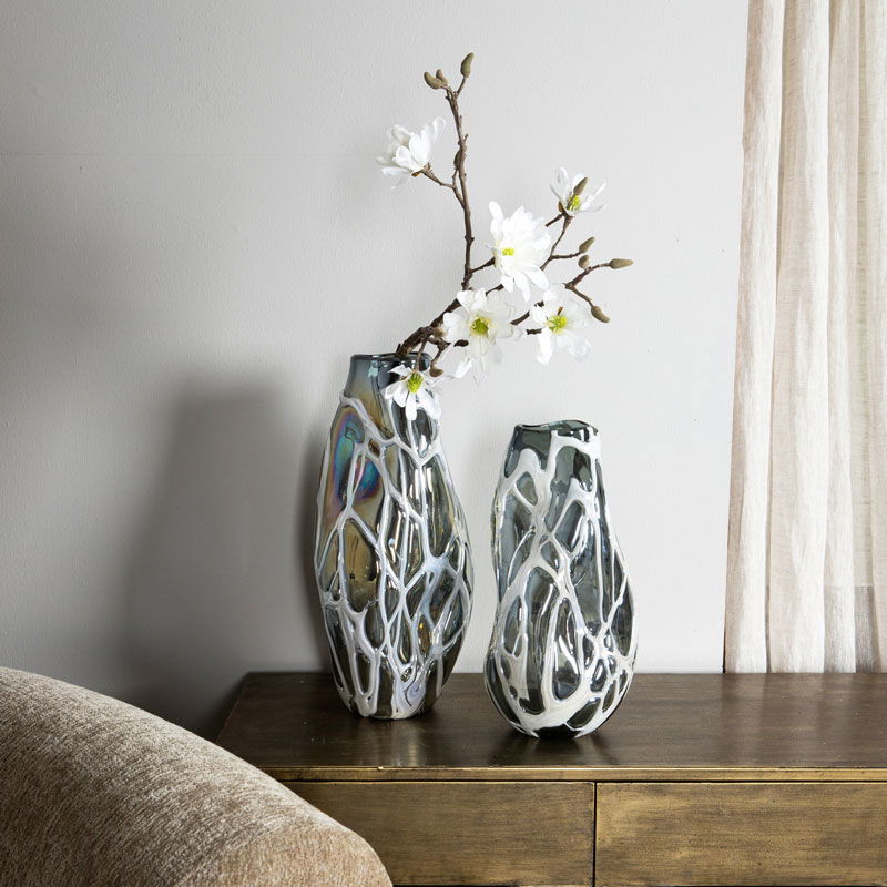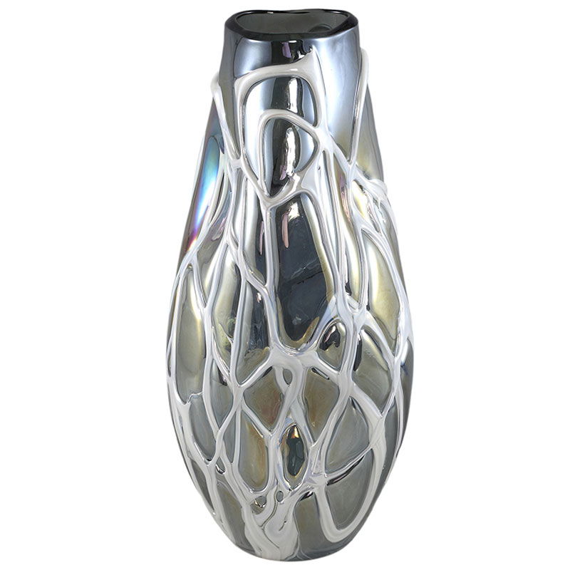 Stijlvolle en bijzonder decoratieve vaas in een metallic grijs glas met een speels kronkelende witte swirl patroon. Een opvallend pareltje voor op een mooi plekje in je huis. Mooi als los object maar ook heerlijk om te vullen met een paar bloemen of mooie decoratietakken.