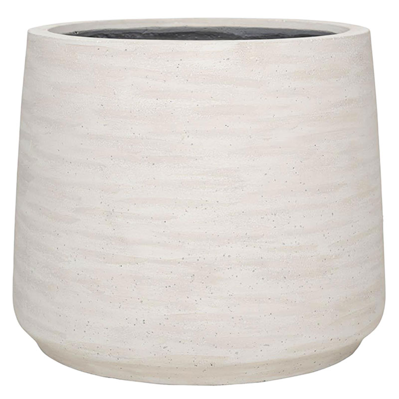 Stijlvolle design bloempot in prachtig zachte ivoorwitte kleur. De bloempot heeft een luxe uitstraling, een prachtige strakke voluptueuze vorm en een verfijnde licht ruwe afwerking. Een pareltje van kunststofsteen met heerlijk gemeleerde matte beton uitstraling in warm wit met een vleugje grijs.