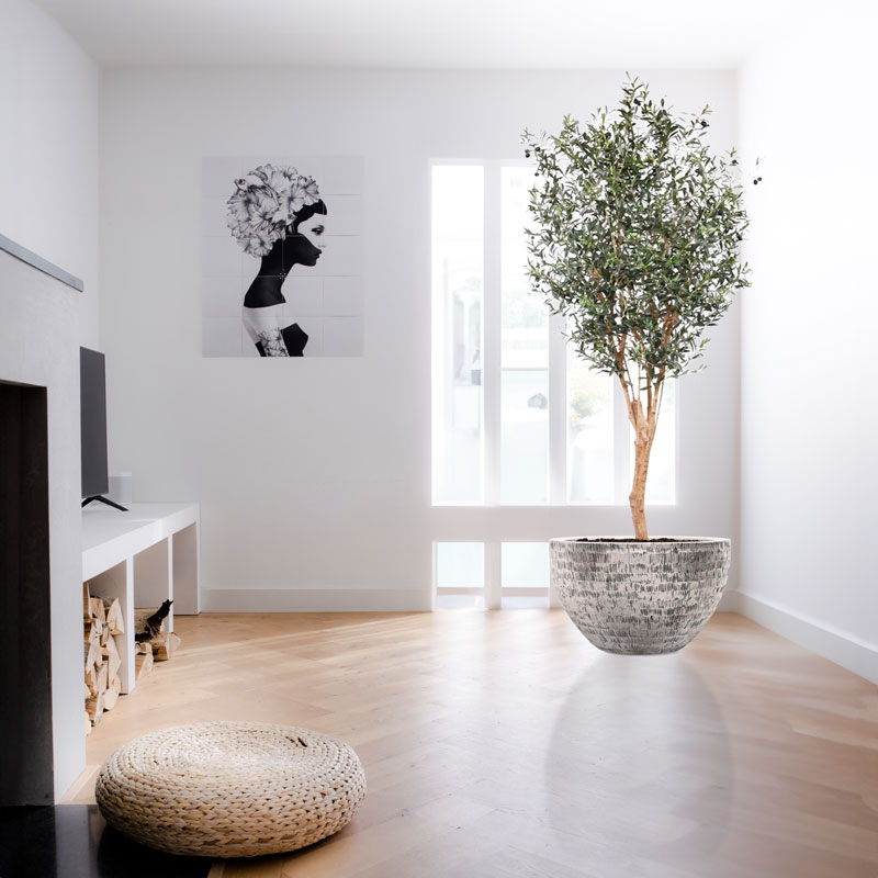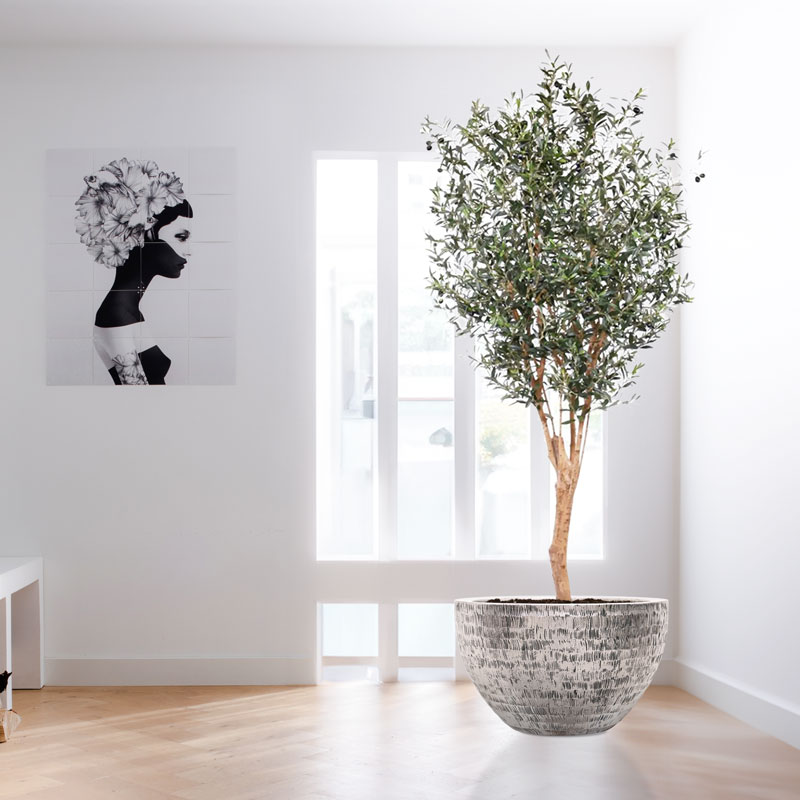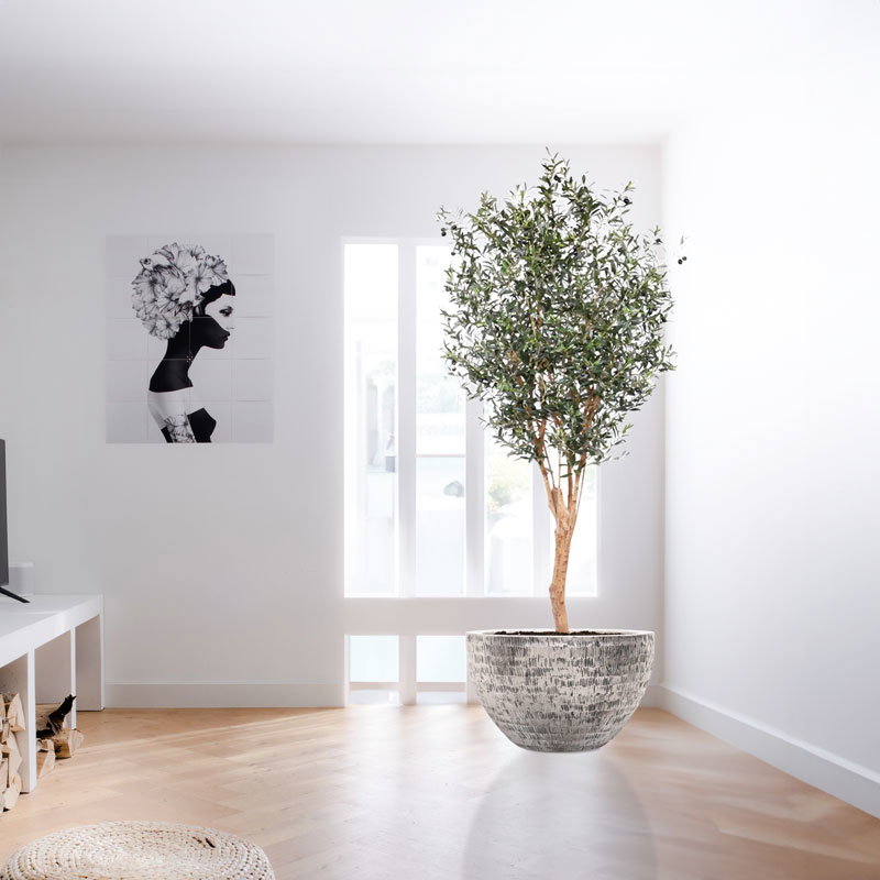 Een robuuste echte houten stam met authentieke vorm en hout zijstammen. Deze heerlijk extra hoge olijfboom brengt je terug naar heerlijke mediterrane zomers. Niet van echt te onderscheiden high quality kunstplant.