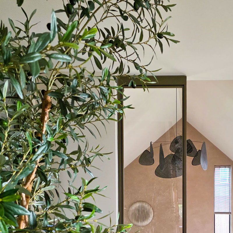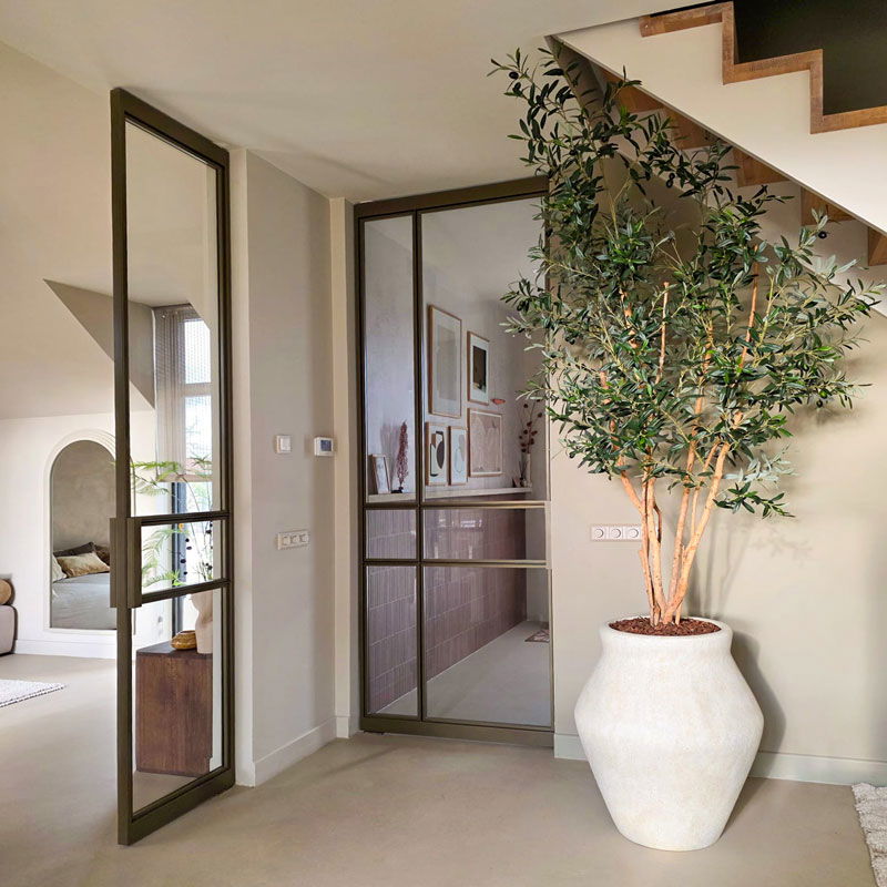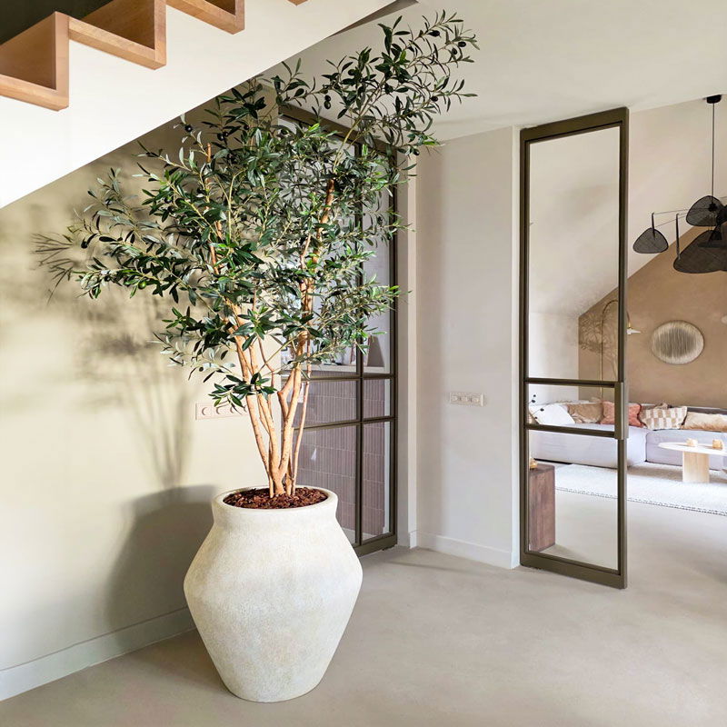 Een prachtige sierlijke vorm, deze heerlijk extra hoge meerstammige Olijfboom met echte houten stammen brengt je terug naar heerlijke mediterrane zomers. Niet van echt te onderscheiden high quality kunstboom.