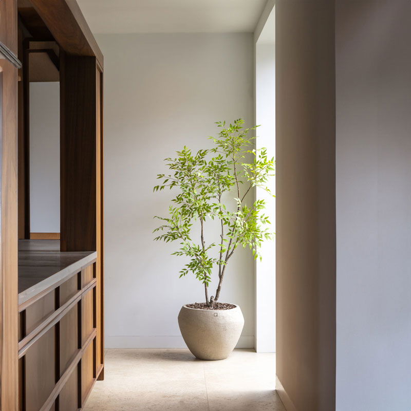 Prachtige fijnbladige Nandina kunstboom, bekend als de hemelse bamboe. Verfijnd en stijlvol met een serene en luxe frisgroene uitstraling. Niet van echt te onderscheiden high quality kunstplant. De charme van een grote kamerplant zonder de zorgen.