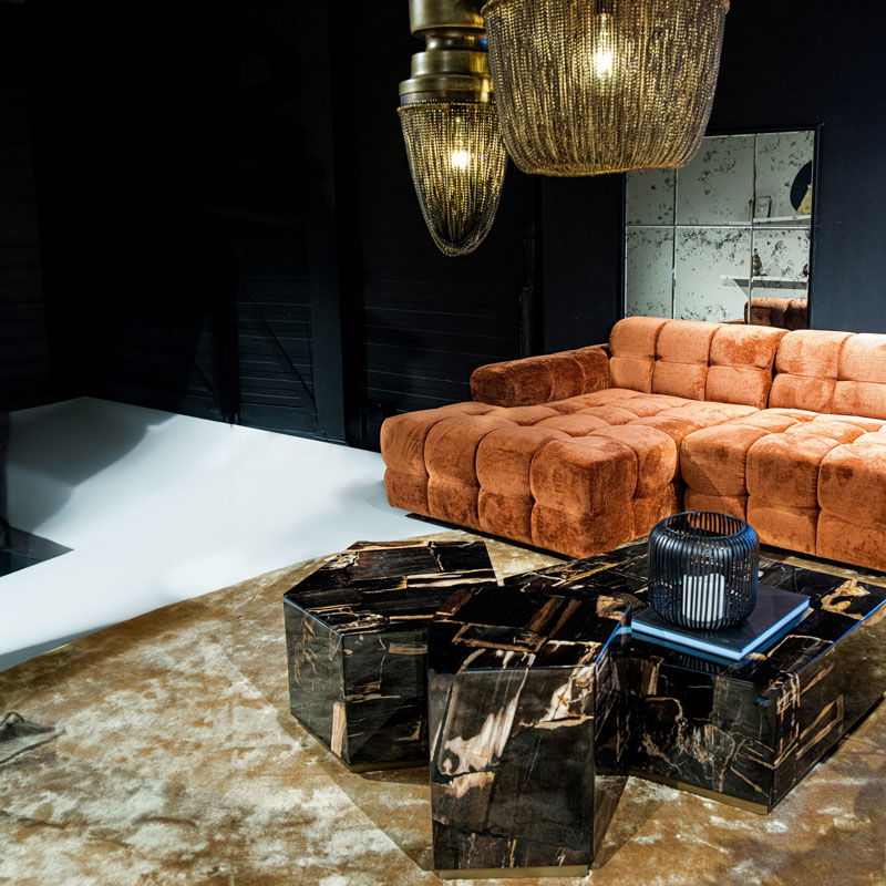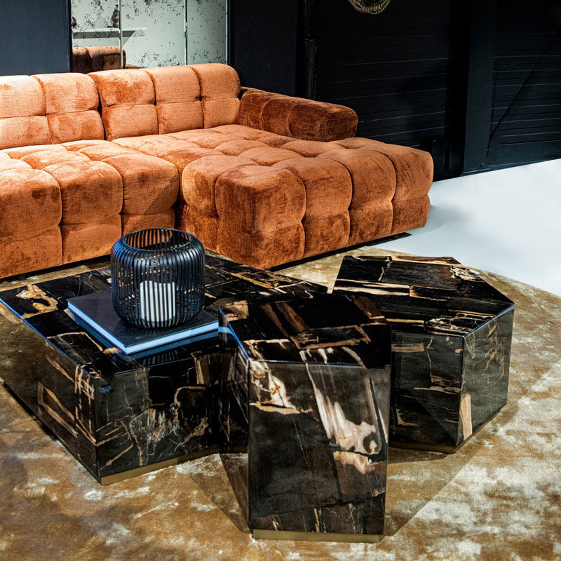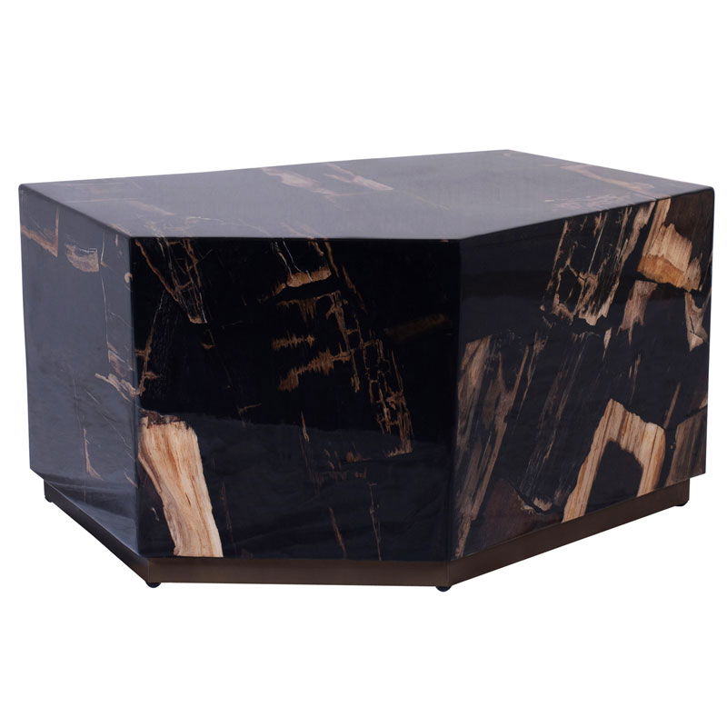 Luxe versteen houten bijzettafel in warm zwart bruin met crème gemeleerd met een glanzende afwerking polyesterhars topcoat. De tafelpoten zijn RVS met messing afgewerkt. Versteend hout is een natuurlijk materiaal waardoor het uiterlijk per item kan verschillen. Dit maakt elk item uniek.