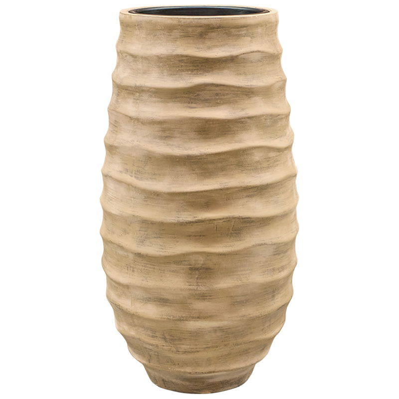 Stijlvolle hoge vaas met een warme uitstraling en een golvend patroon. Een pareltje voor in je tuin of je interieur.