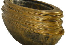 Handgemaakte ovalen design bloempot in luxe antiek goudkleur. De bovenzijde heeft brede rand en een modern speelse twist door de bijzondere belijning. High quality polyresin.