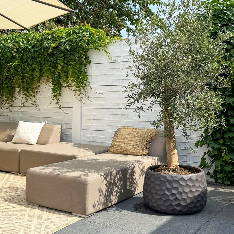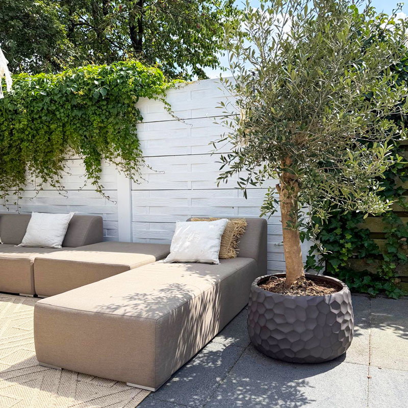 Prachtig vormgegeven bloembak in mat brons bruin. Het reliëf speelt met het licht waardoor je veel diepte krijgt. Met subtiel en opliggend grillig honingraadpatroon. Al jaren één van onze favoriete designs in een nieuwe matte uitvoering.