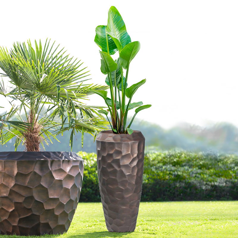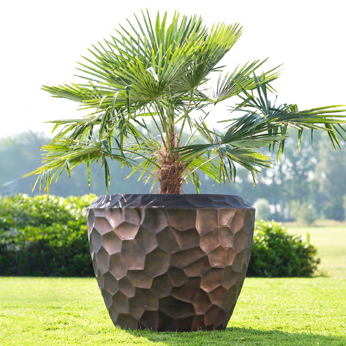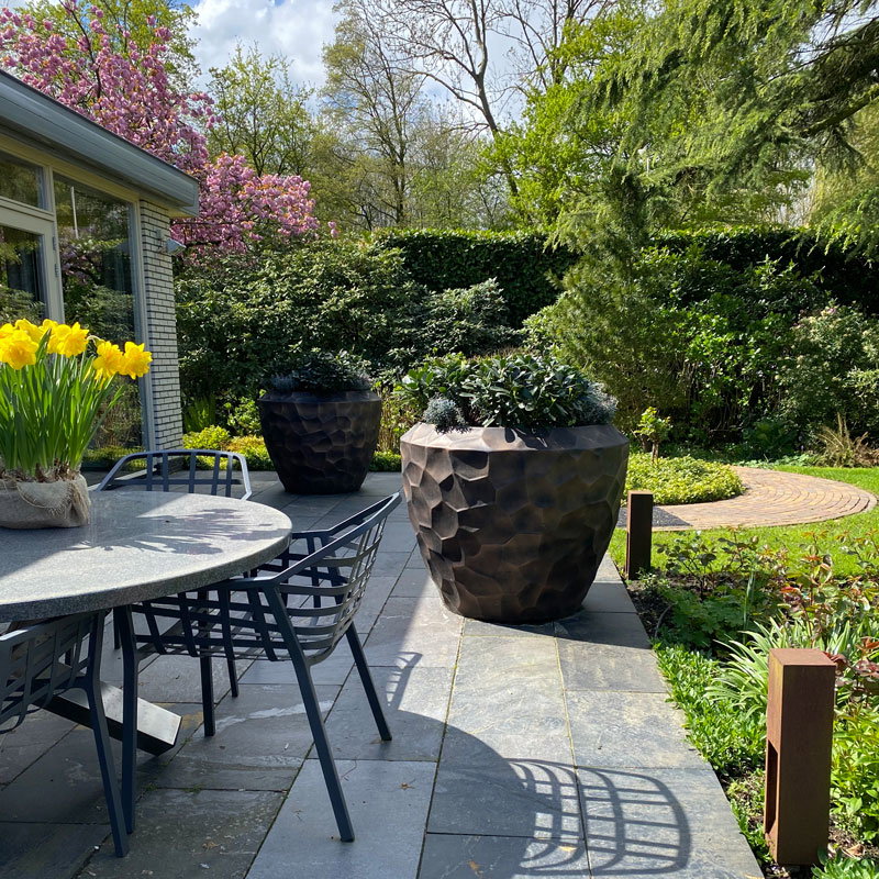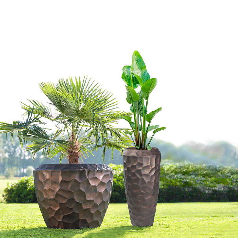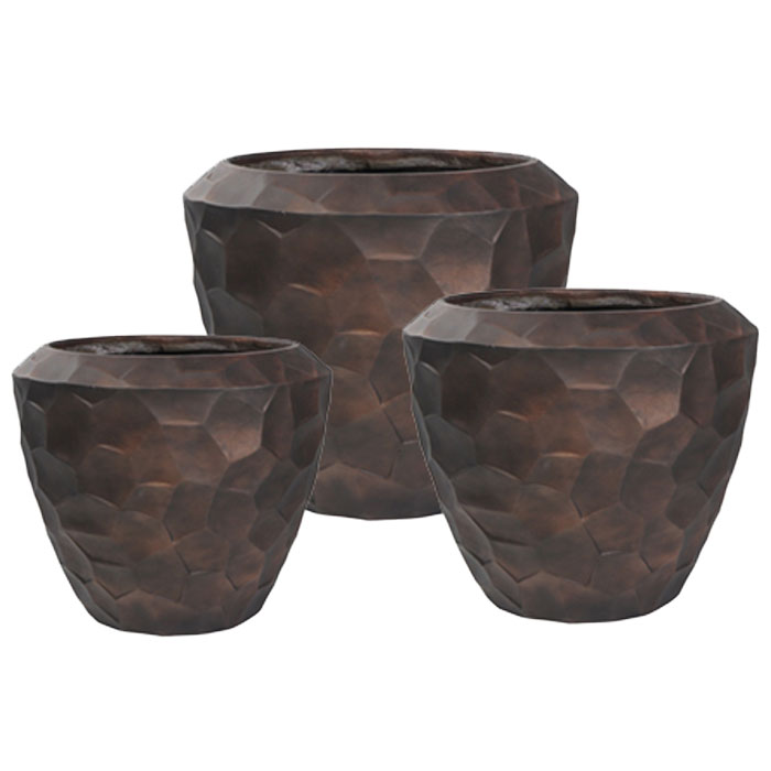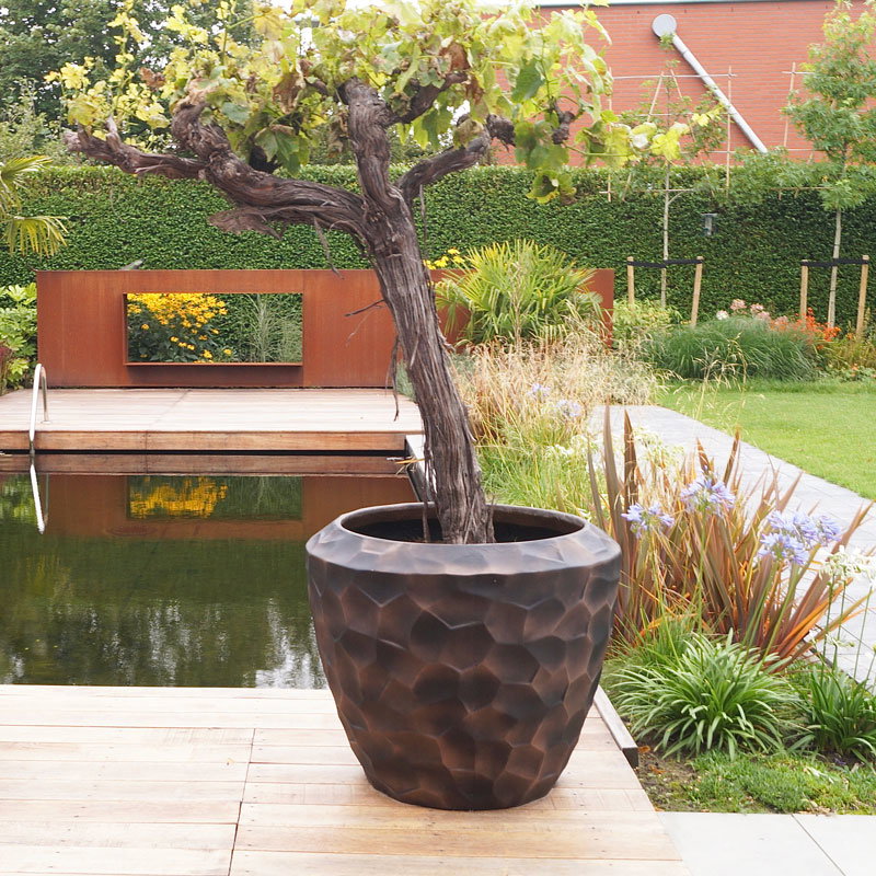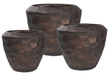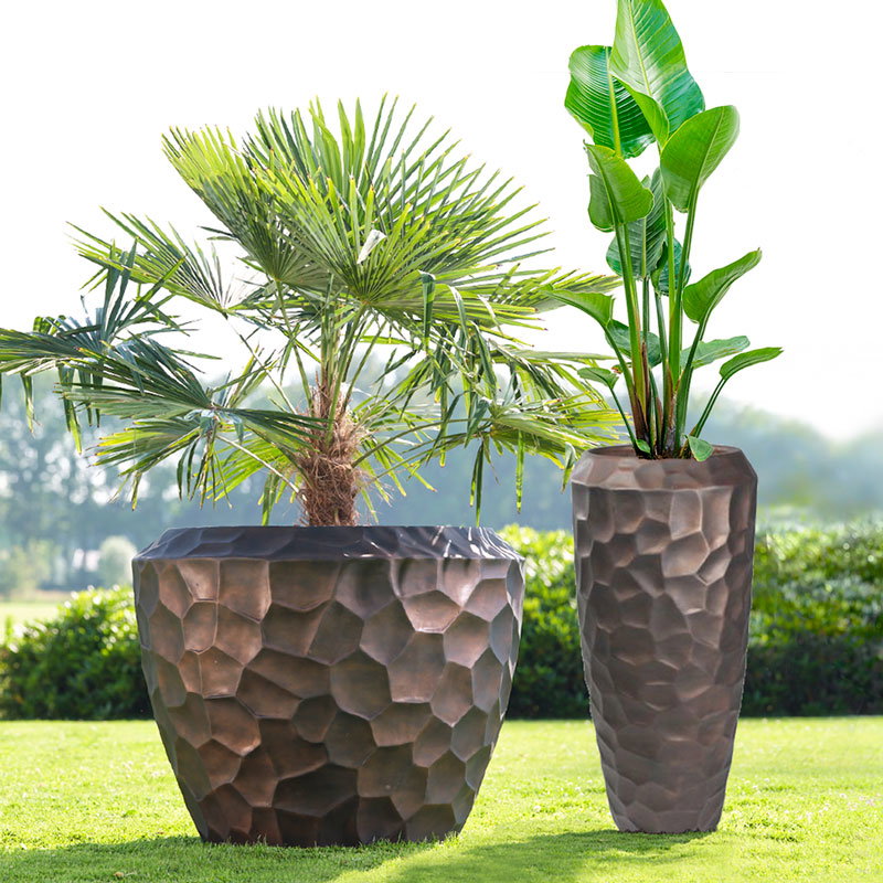Hoge prachtig vormgegeven bloempotten set in mat brons zwart. Zeer lichtgewicht hq set. Het reliëf speelt met het licht waardoor je veel diepte krijgt. Met subtiel en opliggend grillig honingraadpatroon. Al jaren één van onze favoriete designs in een heerlijk matte uitvoering.