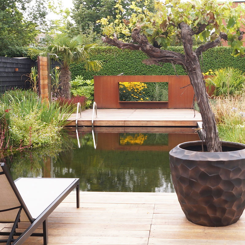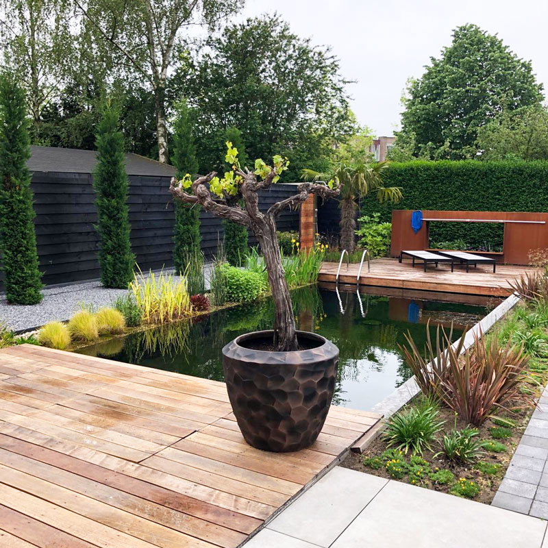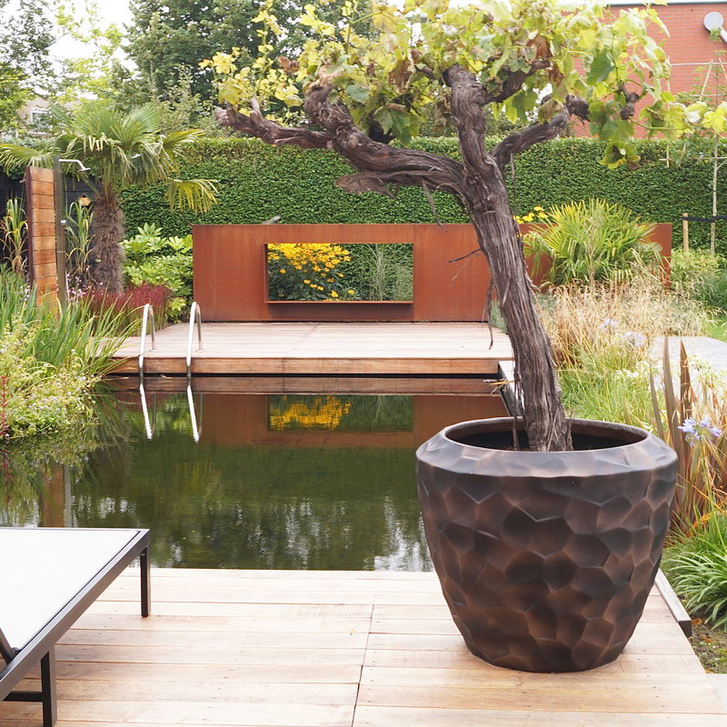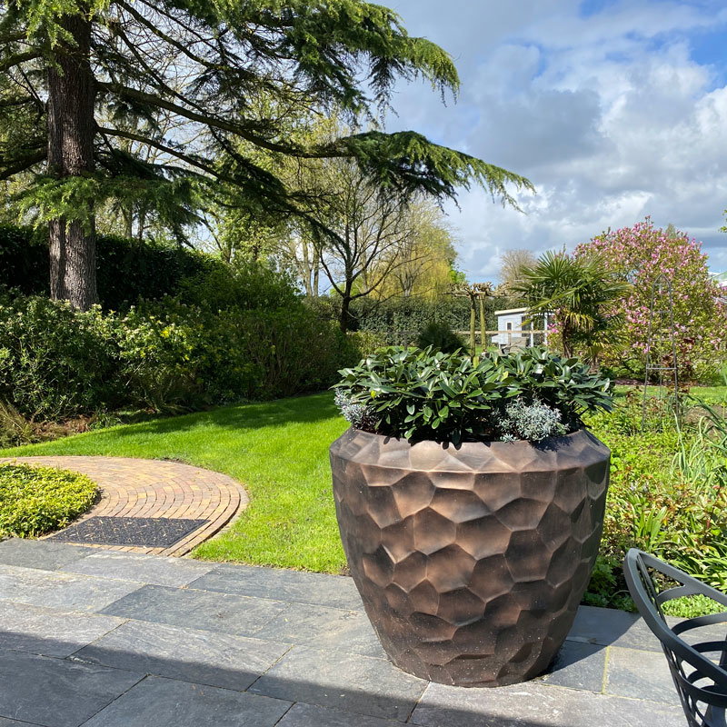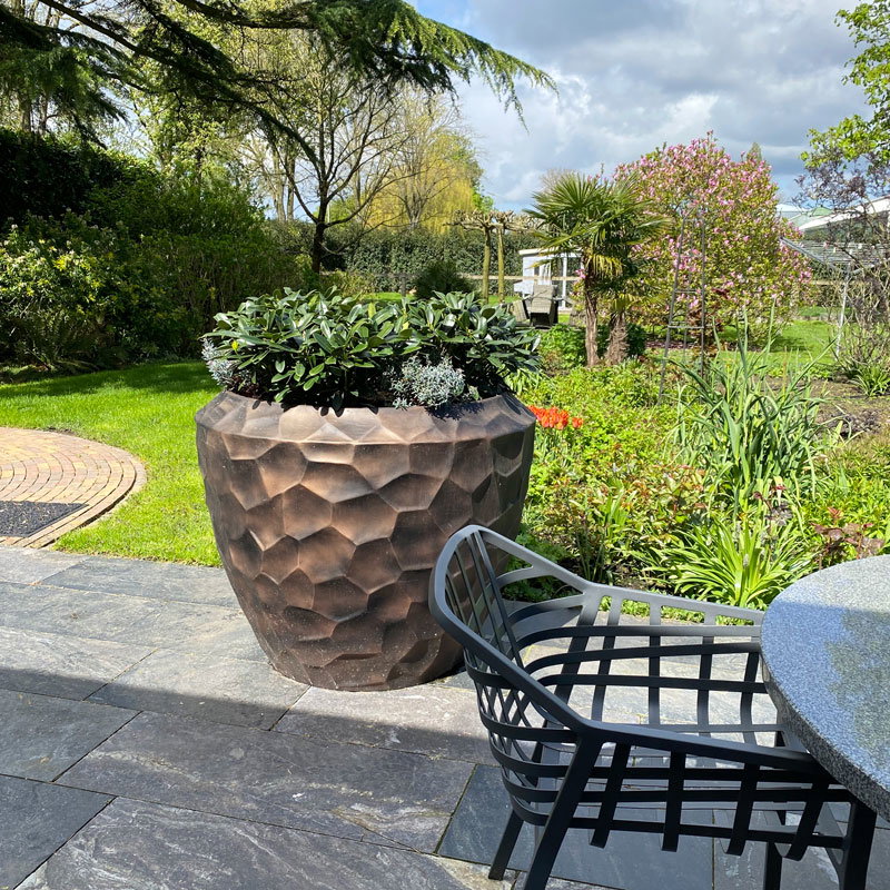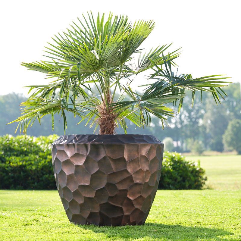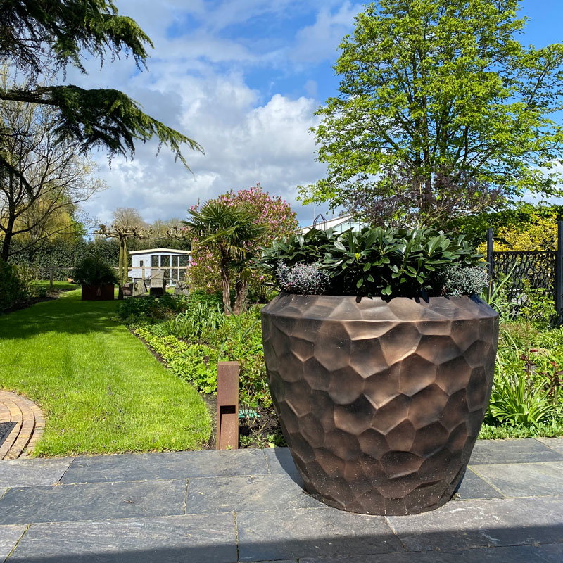 Hoge prachtig vormgegeven bloempotten set in mat brons zwart. Zeer lichtgewicht hq set. Het reliëf speelt met het licht waardoor je veel diepte krijgt. Met subtiel en opliggend grillig honingraadpatroon. Al jaren één van onze favoriete designs in een heerlijk matte uitvoering.