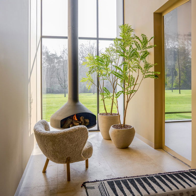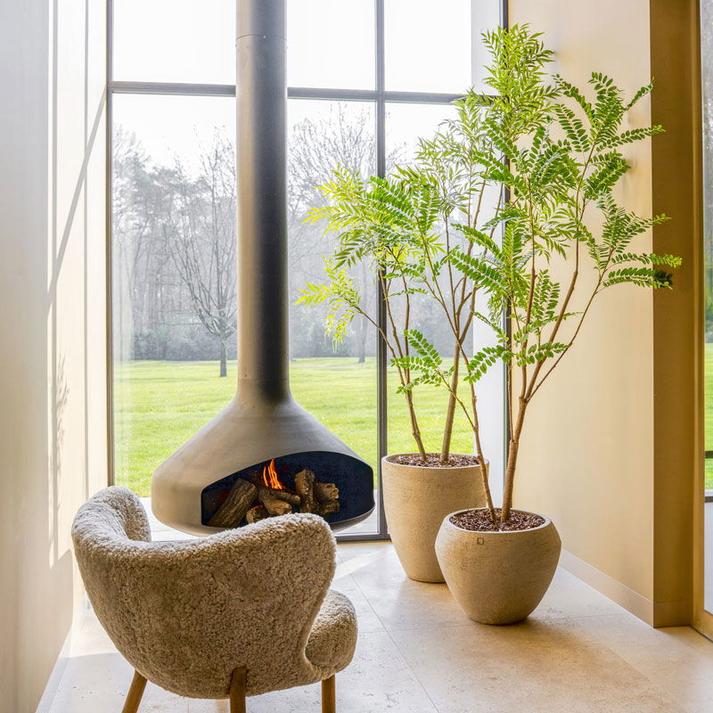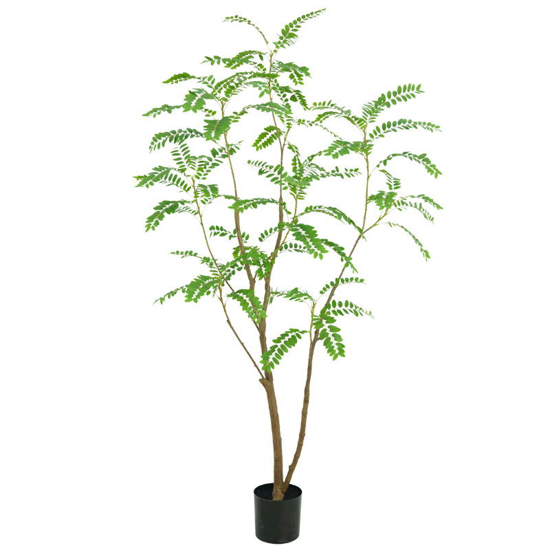Prachtige en hoge fijnbladige mimosa kunstboom. Verfijnd en stijlvol voor een serene, luxe uitstraling. Niet van echt te onderscheiden high quality kunstplant. De charme van een grote kamerplant zonder de zorgen.