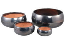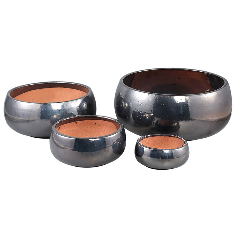 Prachtige set van vier lage bloempotten met luxe uitstraling en vormgeving. Van hoge kwaliteit keramiek met een dikke laag glazuur in stralend zilver. Een heerlijke set voor op een mooi plekje in je huis. Ook heel goed als bonsai schaal te gebruiken.