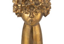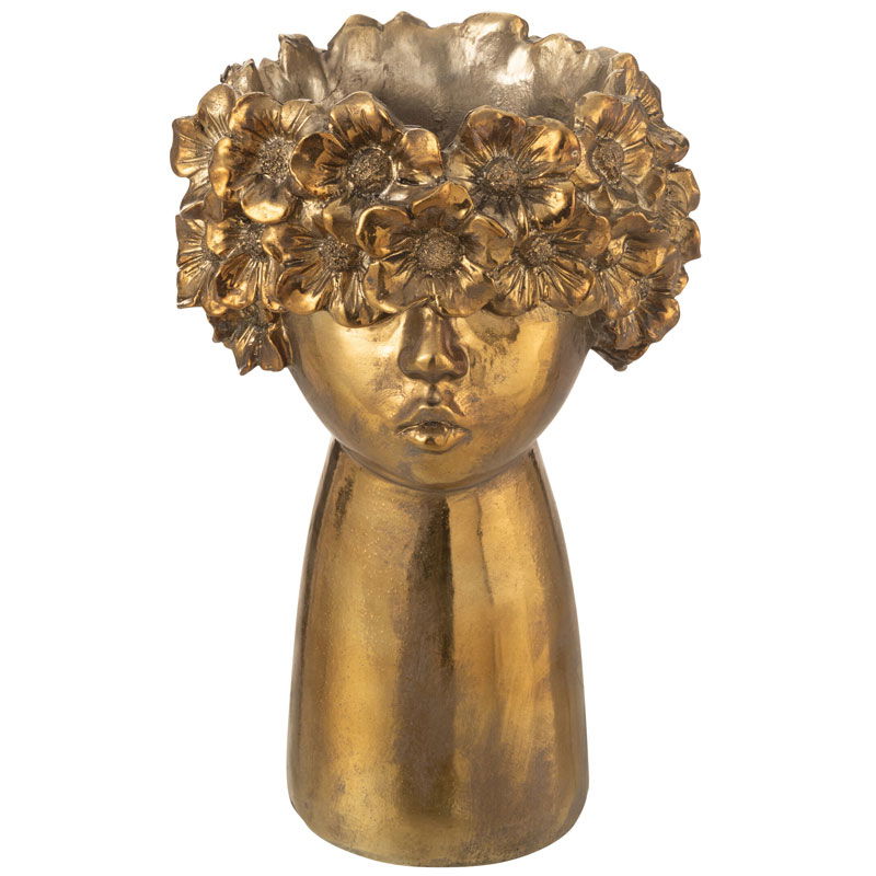 Unieke bloempot in antiek goudkleur met een bijzondere arty vormgeving van een hoofd met bloemenhaar. Een pareltje voor op een mooi plekje in je huis.