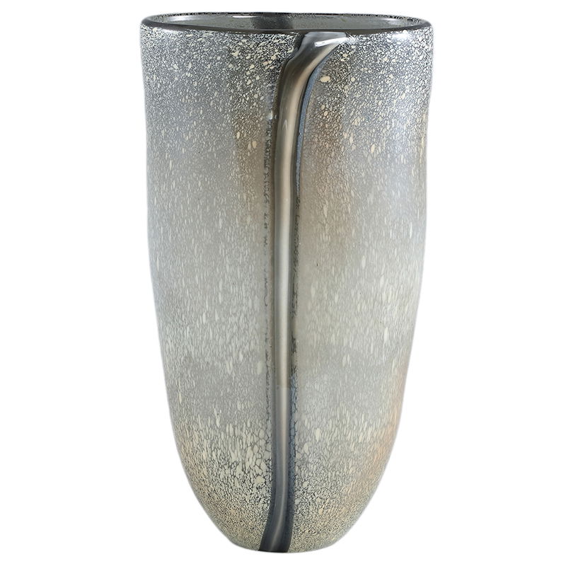 Prachtige handgemaakte bloemenvaas van licht glas met bijzonder zilvergrijs detail.