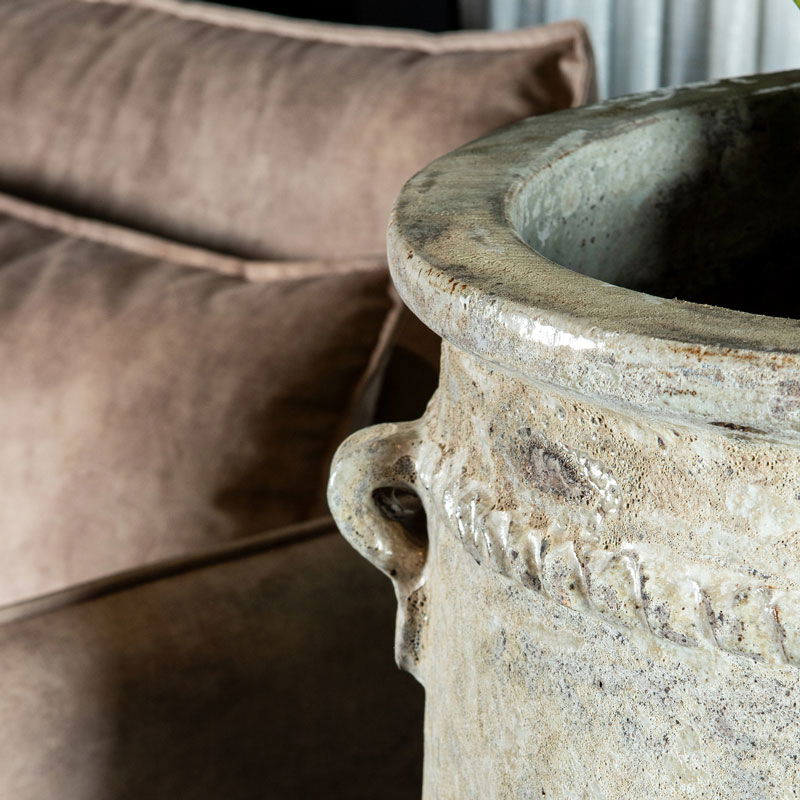Stijlvolle hoge bloempot van high quality handgemaakt keramiek in een mooie speels klassieke vormgeving. De bloempot heeft een bijzondere zacht witte kleur met een authentieke uitstraling. Een eye catcher in je tuin of interieur.
