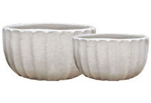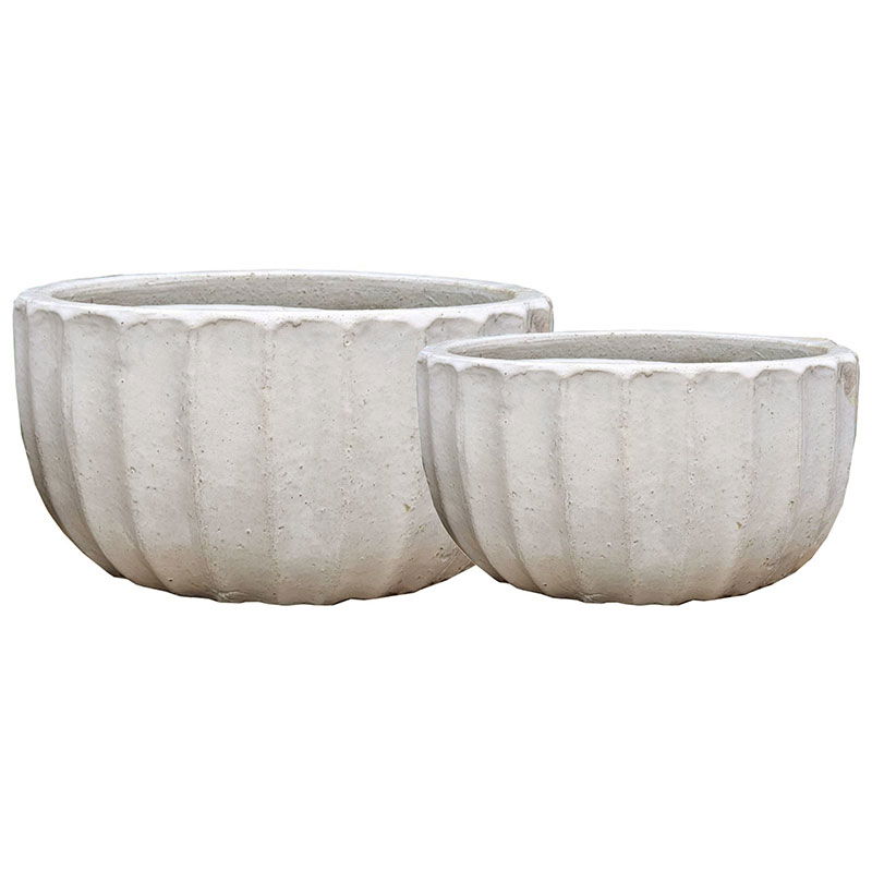 Prachtige set brede bloempotten in verschillende maten. Van authentiek handgemaakt keramiek met een mooie dikke laag glazuur en een verticaal streeppatroon. High quality met een luxe en rustieke uitstraling.