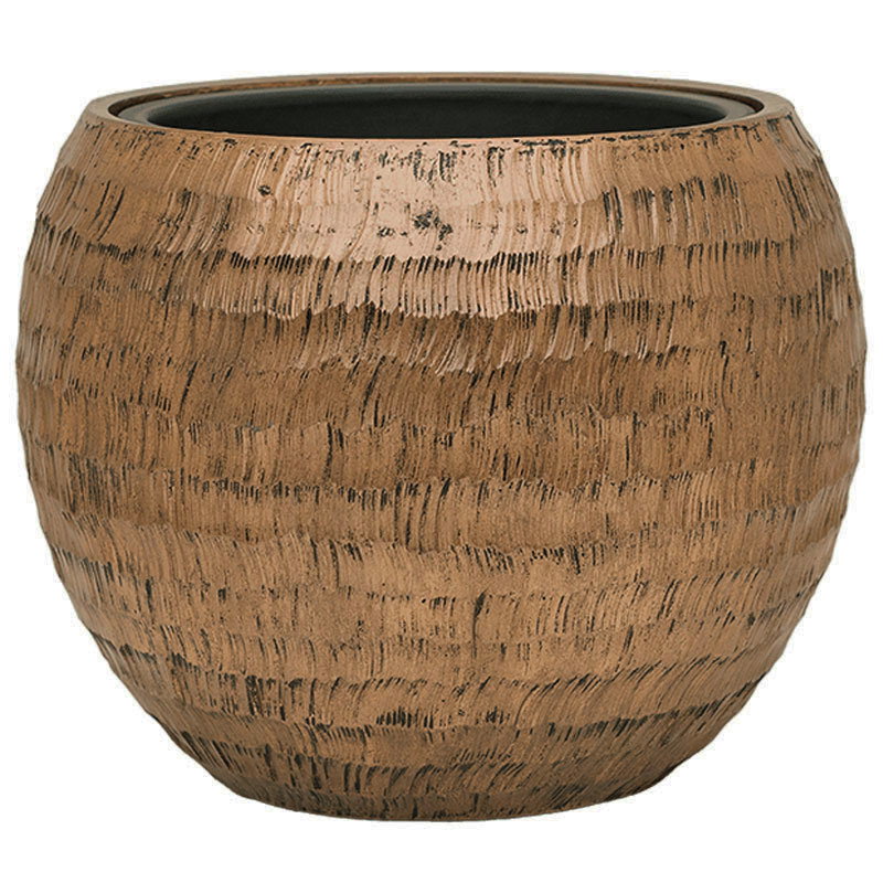 Sfeervolle ronde bloempot met een speels aangebracht design van geborsteld goudbrons met een metallic finish. Van hoogwaardig en oersterk polystone.