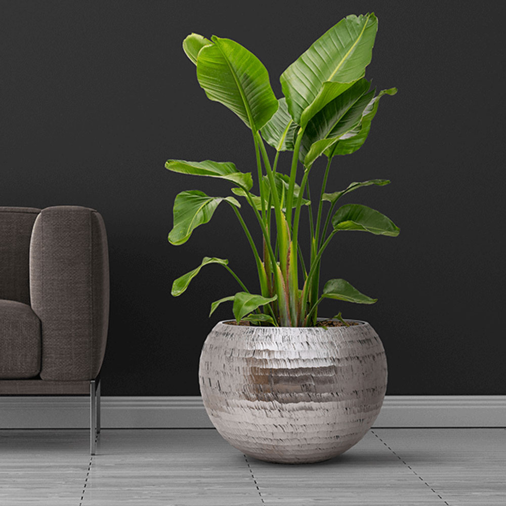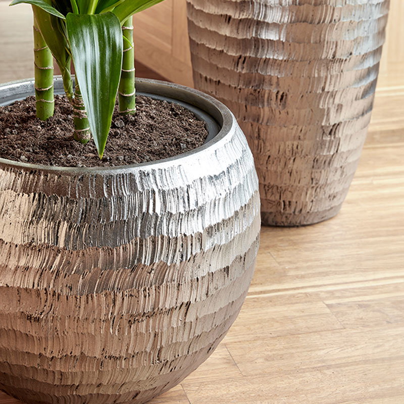 Sfeervolle ronde bloempot met een speels aangebracht design van geborsteld zilver met een metallic finish. Van hoogwaardig en oersterk polystone.