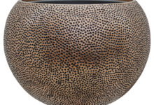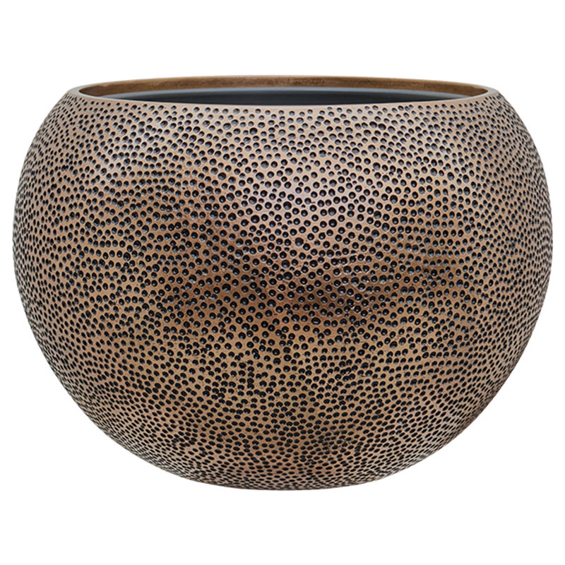 Prachtige brede bloempot in warm en luxe bronskleur met een rijke uitstraling en een speels stippenreliëf. Van lichtgewicht maar oersterk kunststofsteen. Een aanwinst in je interieur.