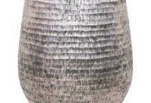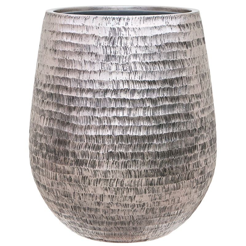 Prachtige hoge bloempot met mat metallic finish met een speels aangebracht design van geborsteld metaal. Van hoogwaardig en oersterk polystone.