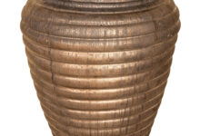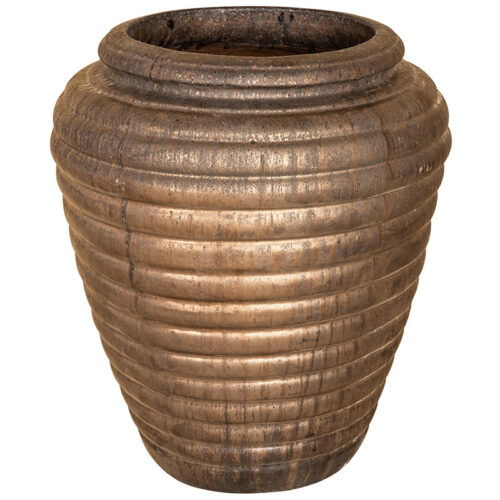 Bijzondere grote bloempot in een brons kleur en een horizontaal streeppatroon. De kleur in combinatie met de fijne vorm maakt deze vaas tot een bijzonder pareltje voor op een mooi plekje in je interieur.
