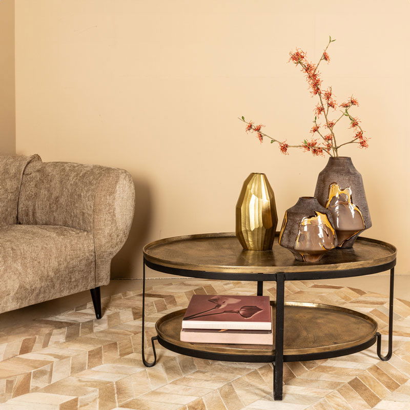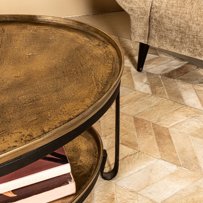 Stijlvolle dubbellaagse salontafel van gegoten aluminium in een subtiele metallic mat goud met zwart ijzeren poot. Heel leuk te combineren met de andere tafels uit de serie met verschillende hoogtes voor een visueel stijlvol effect. Het ontwerp is luxe en een tikkeltje stoer. Voor het schoonmaken van het blad adviseren wij de Metal & Chrome Cleaner van Oranje Furniture Care.