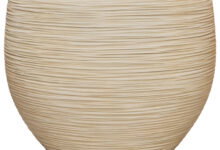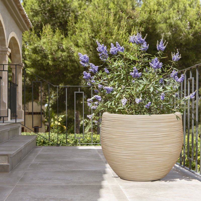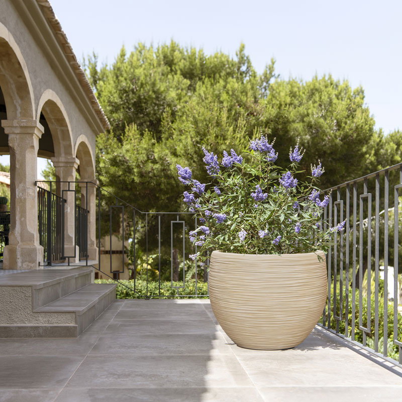Fijne natuurlijke serie in zachte kleur met gestreept d3 patroon in zachte vormen. Elk stuk is handgemaakt van hoogwaardig brandvertragende fiberclay en UV-proof om lang te genieten van de kleur zowel indoor als outdoor. Een pareltje voor in je huis of tuin.