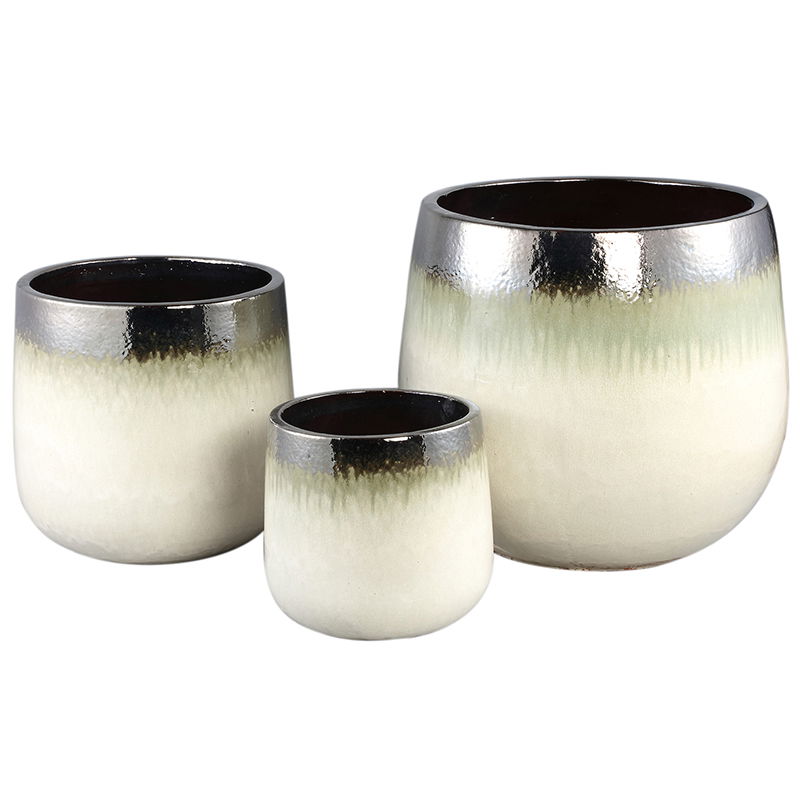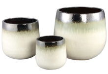 Prachtige set van 3 fijne bloempotten in een zachtmodel en van authentiek handgemaakt keramiek met een dikke glazuurlaag. High quality met een luxe en rustieke uitstraling en dip-dye kleuring van metallic zwart, olijfgroen naar natuurlijk beige.