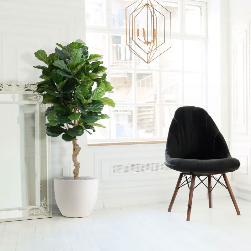 Prachtige hoge grootbladig tabaksplant – ficus lyrata met echte houten stam. Niet van echt te onderscheiden high quality kunstplant. De charme van een grote kamerplant zonder de zorgen.