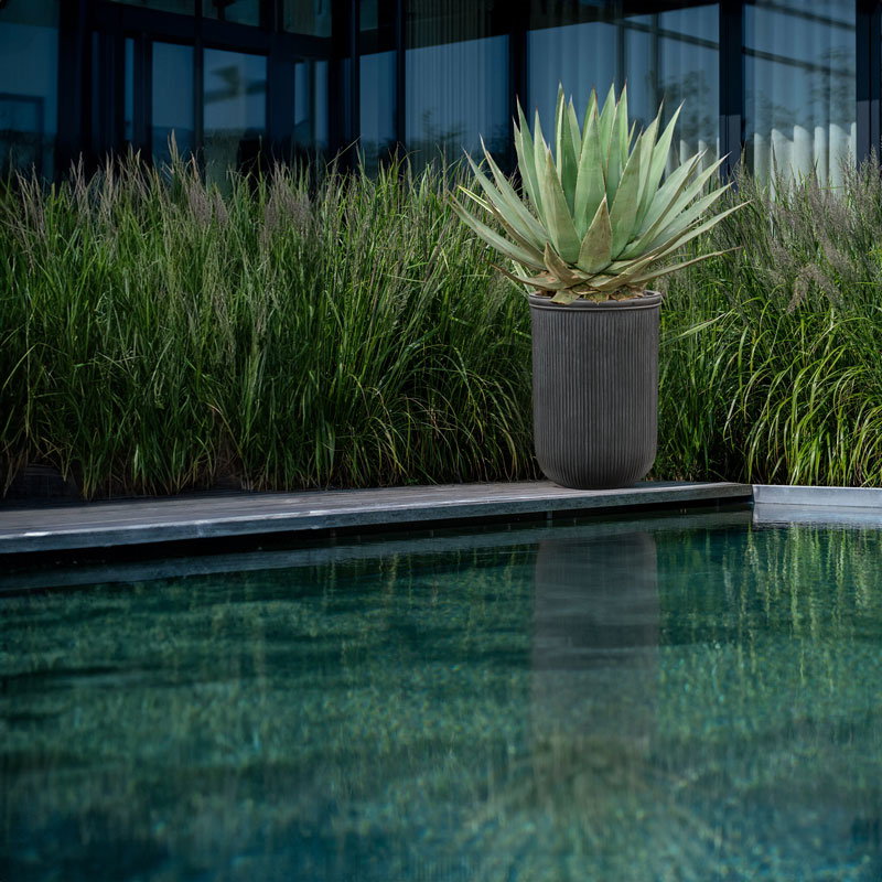 Fijne natuurlijke serie in zachte kleur met verticaal gestreept d3 patroon in zachte vorm met elegante klassieke rand. Elk stuk is handgemaakt van hoogwaardig fiberclay en UV-proof om lang te genieten van de kleur zowel indoor als outdoor.