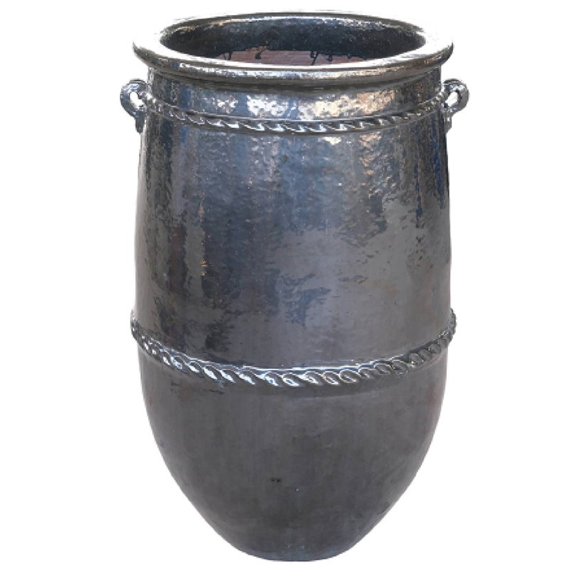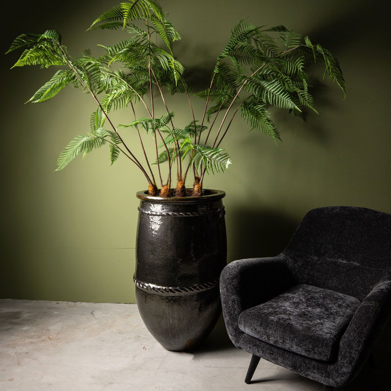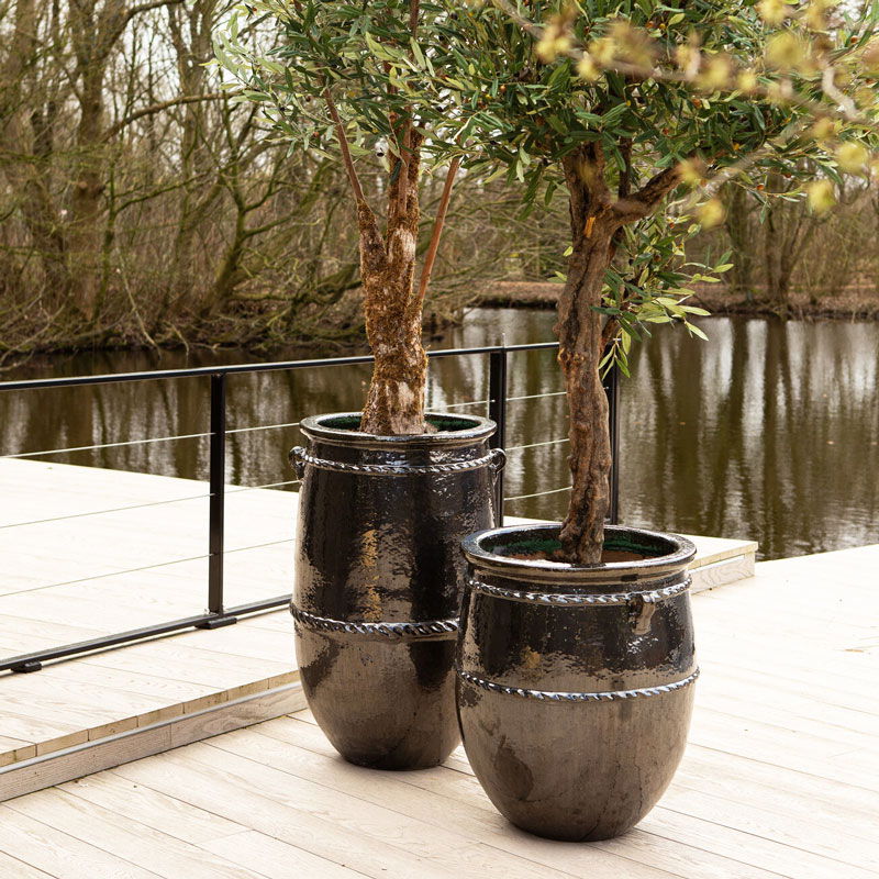 Stijlvolle hoge bloempot van high quality handgemaakt keramiek in een mooie speels klassieke vormgeving. De bloempot heeft een bijzondere kleur donkergroen met een intense glans. Een eye catcher in je tuin of interieur.