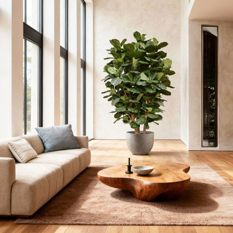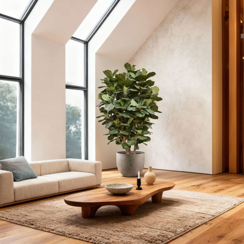Prachtige hoge grootbladig tabaksplant – ficus lyrata met echte houten stam. Niet van echt te onderscheiden high quality kunstplant. De charme van een grote kamerplant zonder de zorgen.