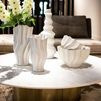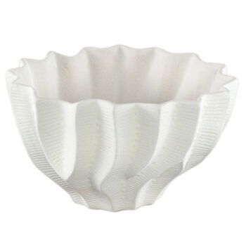 SOORTPrachtige schaal met luxe uitstraling en bijzondere look met wave patroon. Stijlvol wit keramiek in een betoverende vormgeving. Een pareltje voor op een mooi plekje in je huis en heel mooi om te combineren met de andere vazen uit deze lijn.