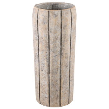 SOORTHoge decoratie vaas robuust en landelijk cement in taupe met een verticaal streepdessin. Een pareltje voor op een mooi plekje in je huis en heel mooi om te combineren met de andere vazen uit deze lijn. Leuk om te vullen met een plant of zijden bloesem takken.